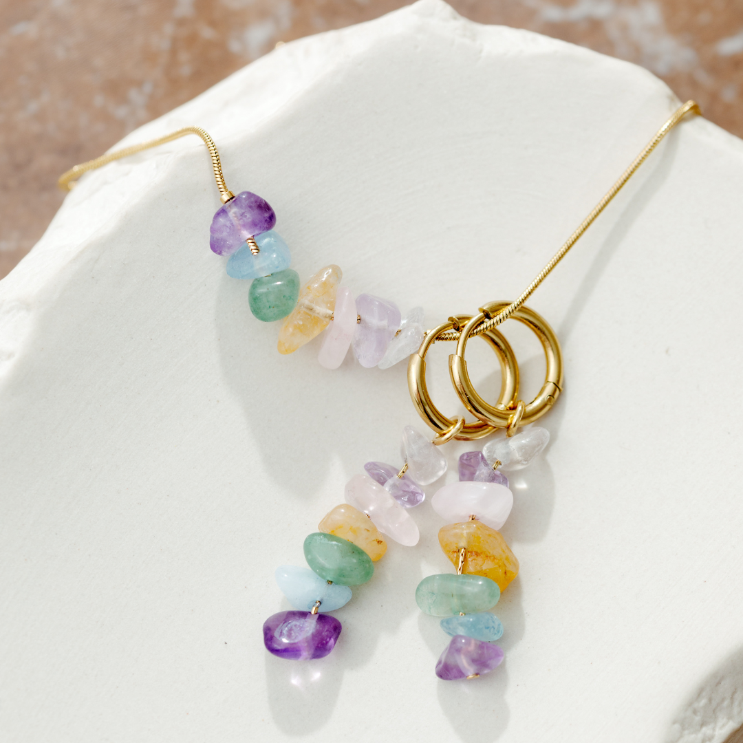 Bei LUAMAYA werden echte und synthetische Edelsteine mit vergoldetem Edelstahl kombiniert. Diese Verbindung von Naturstein und Edelmetall sorgt für Haltbarkeit, Hautverträglichkeit und ein harmonisches Gesamtbild. Ob Ohrstecker, Ohrringe, Halsketten, Armbänder, oder Ringe, jeder Schmuckstein wird so eingefasst, dass seine individuelle Struktur sichtbar bleibt.