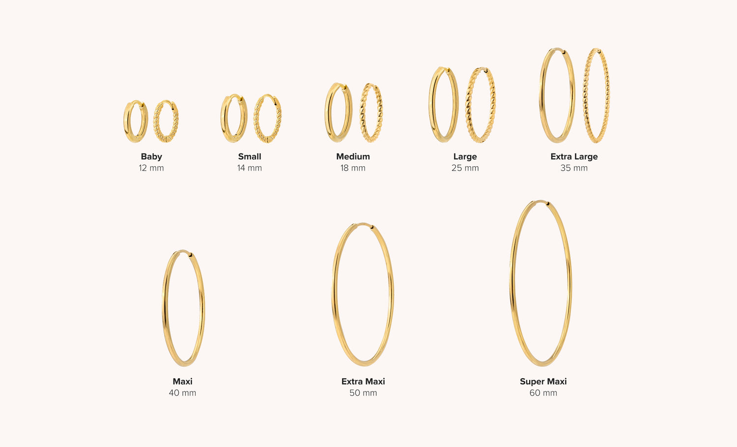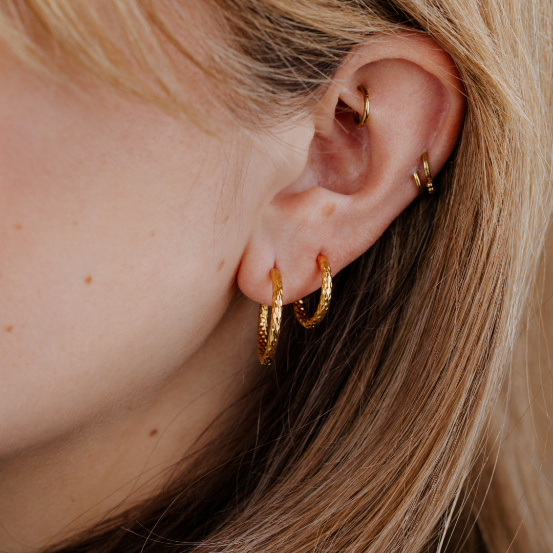 - Orecchini a cerchio medi, misure M, L e XL (circa 18–35 mm): perfetti per ogni occasione. Né troppo grandi, né troppo piccoli: perfetti sia per l'ufficio che per un look casual.