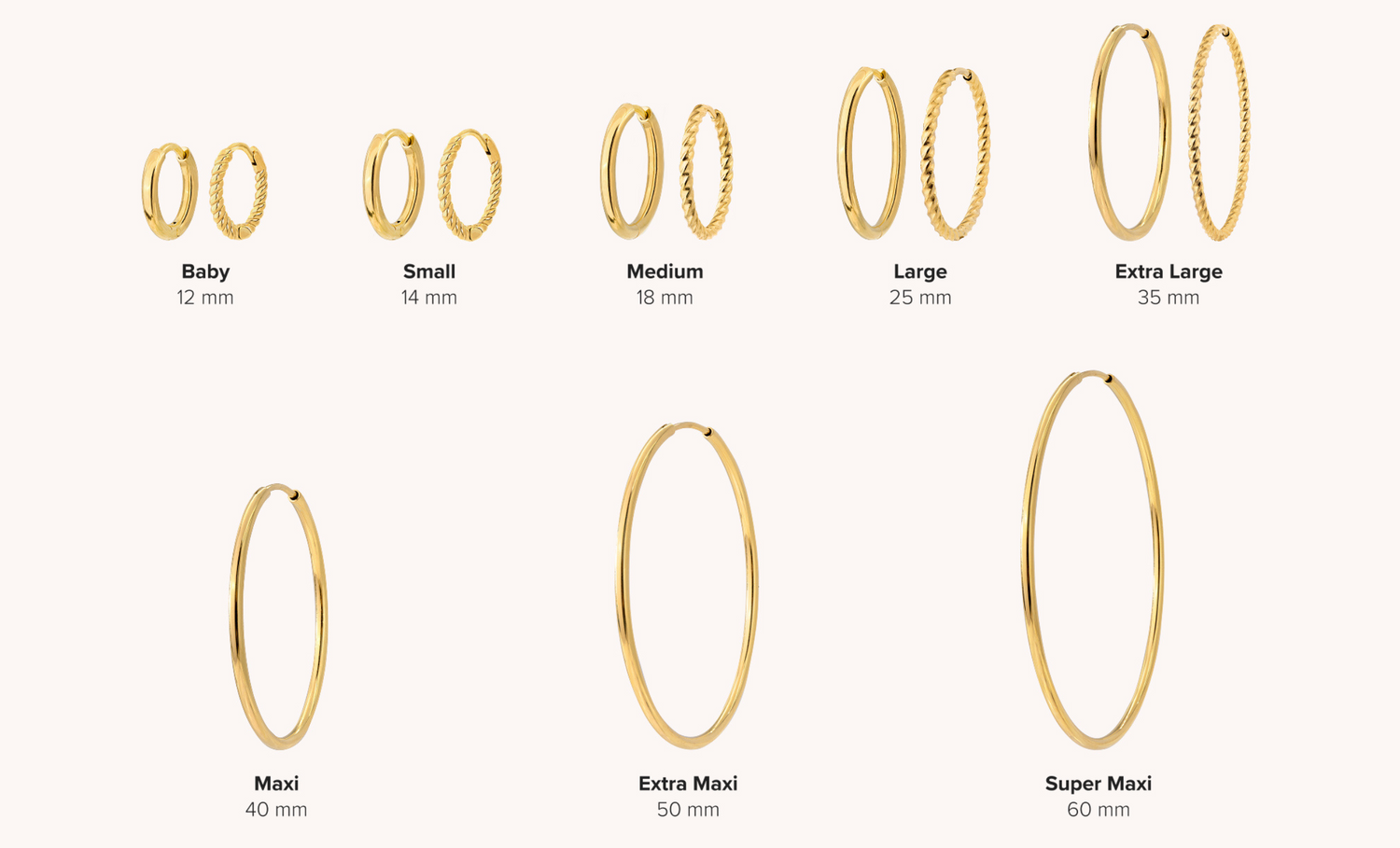 - Grandi cerchi, misure Maxi, Extra Maxi e Super Maxi (40-60 mm): un vero e proprio pezzo forte . Attirano l'attenzione e sono ideali per le occasioni speciali, i look serali o come elemento di spicco nella vita di tutti i giorni.