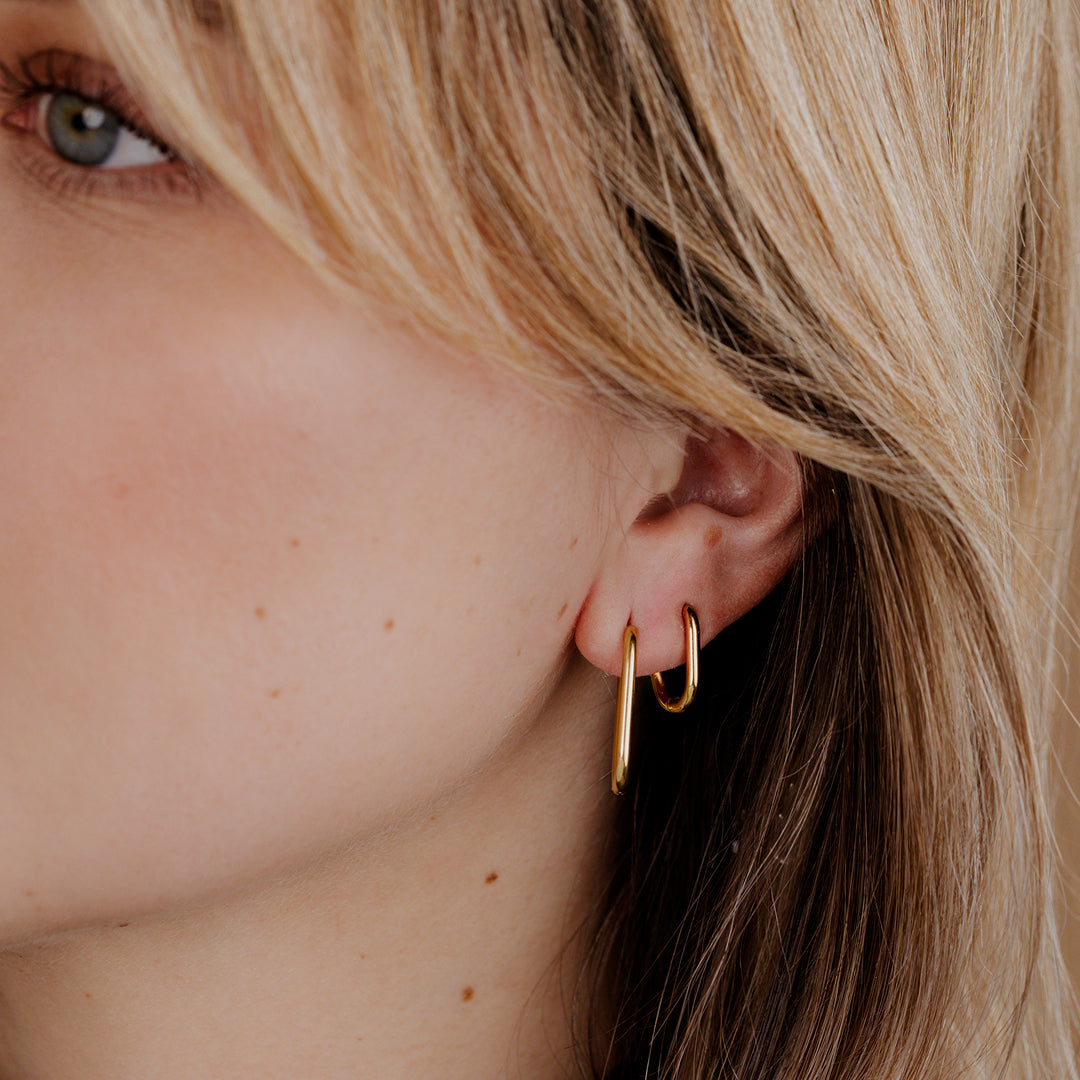 Oltre agli orecchini a cerchio rotondi, anche gli orecchini a cerchio ovali sono una vera tendenza. La loro forma allungata conferisce loro un aspetto più moderno e allunga visivamente il viso, il che è particolarmente valorizzante.