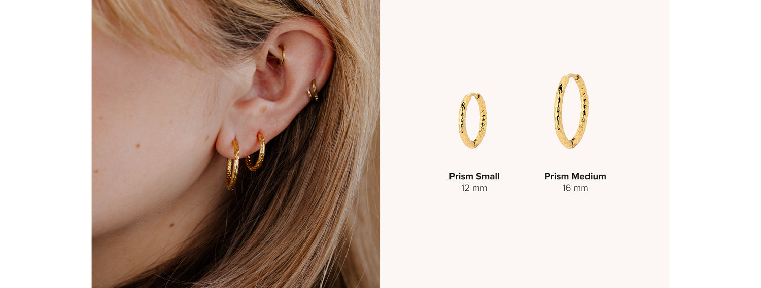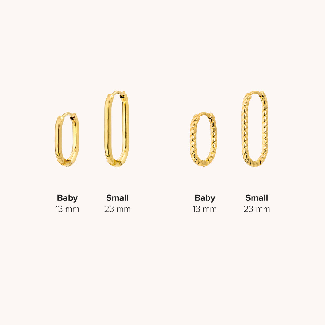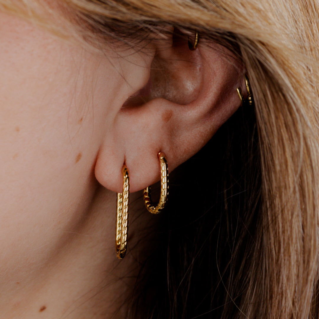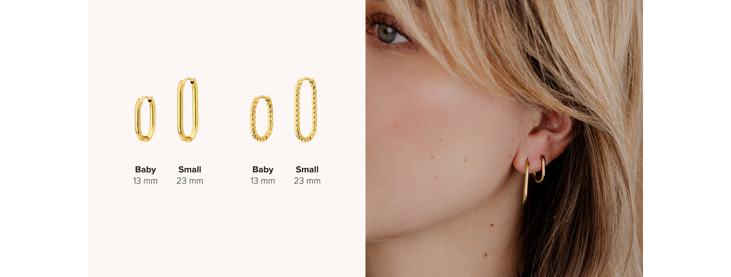 La scelta della misura giusta per gli orecchini a cerchio dipende dal look che desideri ottenere e dall'occasione in cui li indossi. Per aiutarti a trovare la misura perfetta, ecco alcuni consigli, prendendo come esempio i nostri orecchini a cerchio puliti e intrecciati: