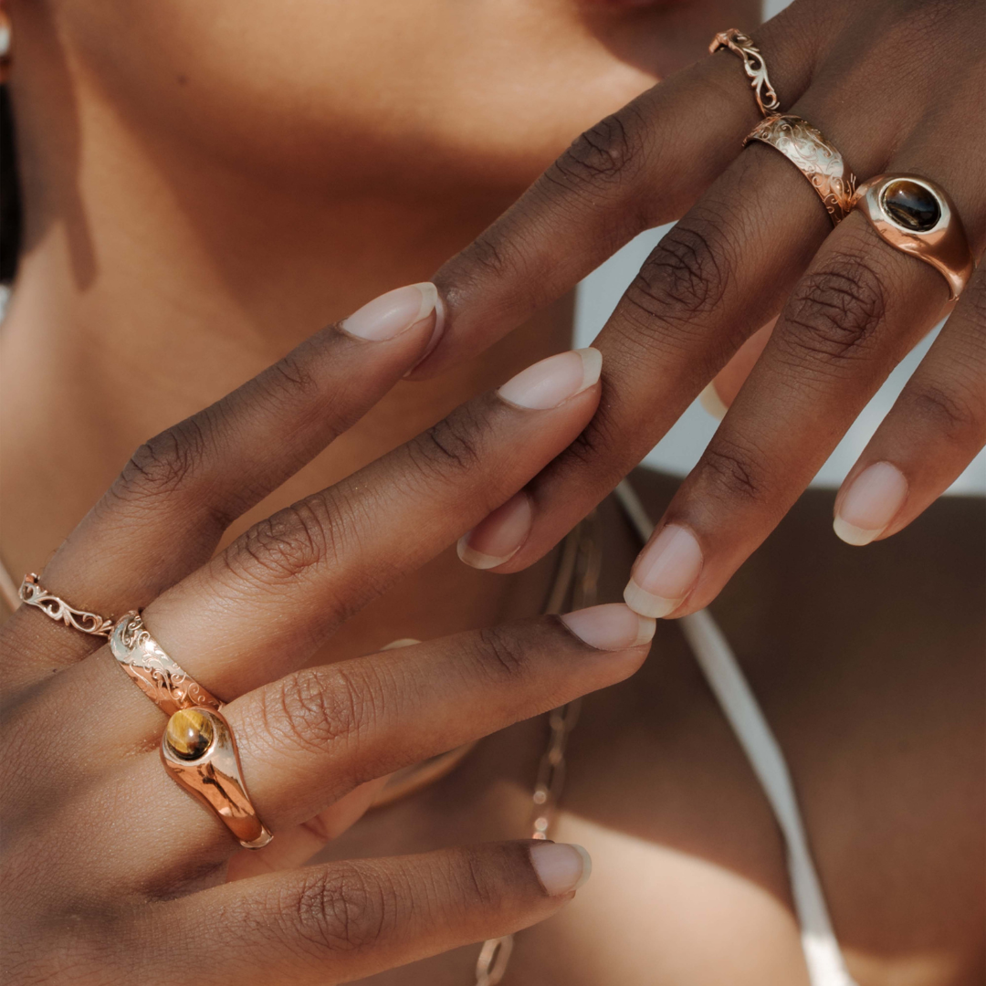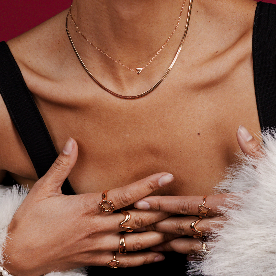 Die Basis aus Edelstahl macht Roségold nicht nur robust, sondern auch nickelfrei, was Hautverträglichkeit gewährleistet. Dadurch lassen sich Ringe, Armbänder, Ketten und Anhänger täglich tragen, ohne dass Hautirritationen auftreten.