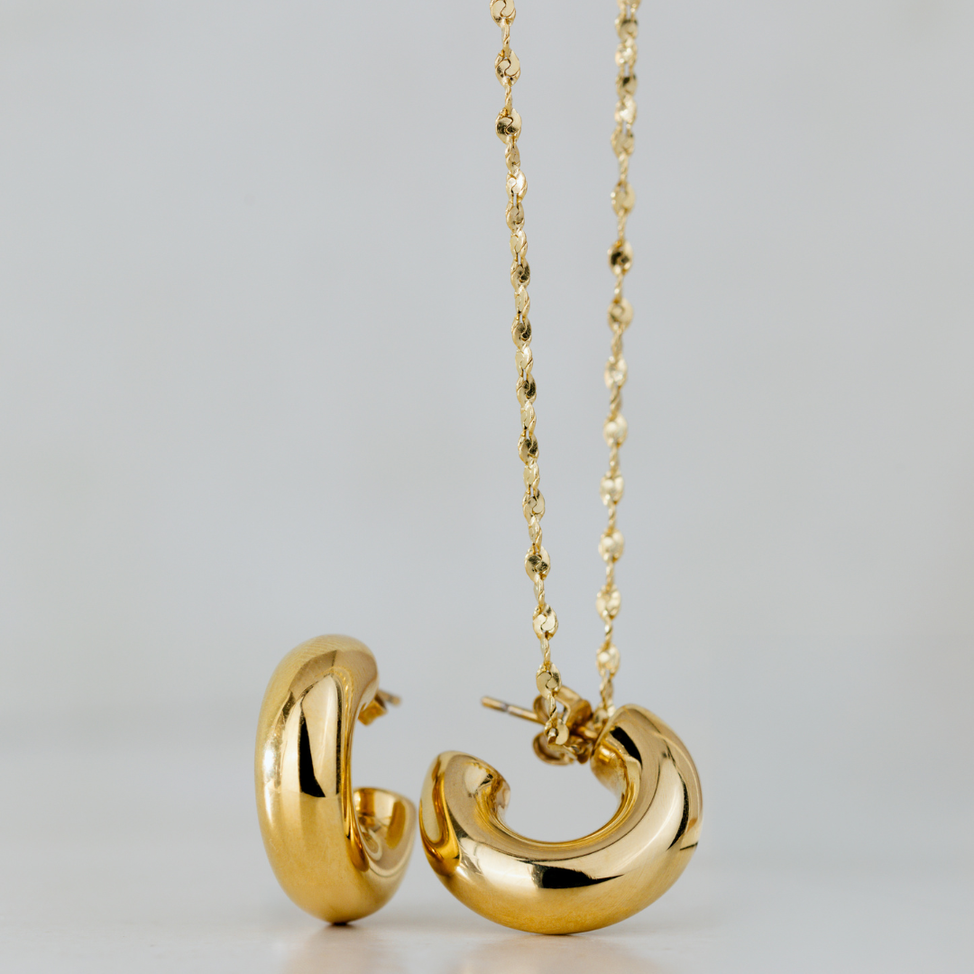 Un po’ audace va bene per te, ma non troppo, e con un tocco di eleganza senza tempo? Allora il nostro bundle “Cheeky” è perfetto per te! Mentre i nostri orecchini “Bulky” Hoop Studs sono più vistosi e adatti a uno stile edgy, la nostra collana “Tinsel Chain” con i suoi piccoli e delicati anelli della catena è molto più raffinata e dettagliata. Tuttavia, questi due pezzi si completano perfettamente, donandoti un look trendy e moderno.