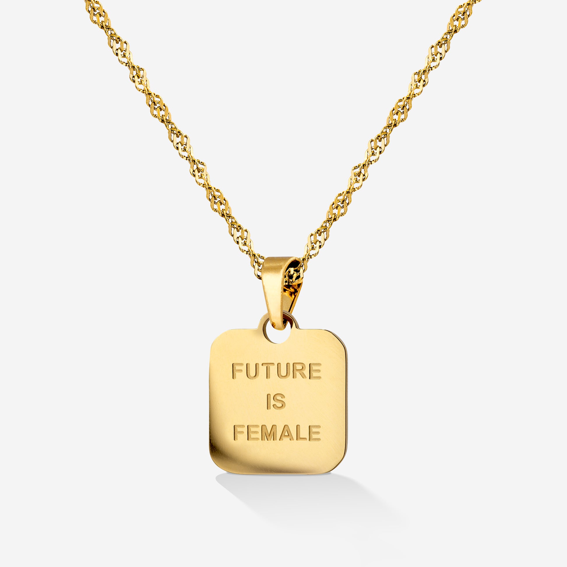 La nostra collana 'Future is female' è più di un semplice gioiello: è una dichiarazione chiara e potente. Indossala come promemoria della tua forza e del cambiamento che puoi contribuire a creare ogni giorno, per un futuro luminoso e positivo. Il ciondolo quadrato sulla nostra Slim Singapore Necklace è senza tempo e minimalista, conferendogli un tocco particolarmente elegante. Da sola o abbinata ad altre nostre collane, questo gioiello è il compagno perfetto per ogni donna forte, con visione e ispirazione.