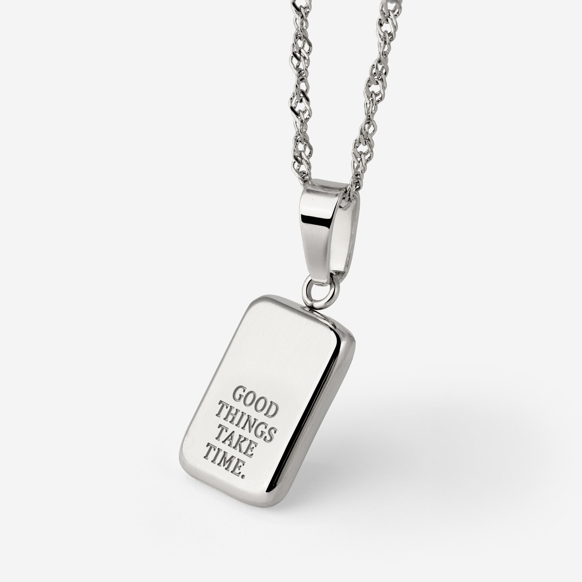 A volte sembra che nulla proceda e che tu sia bloccato in un punto. La collana “Good things take time” ti ricorda che ci vuole tempo perché le cose si realizzino. Quando arriverà il momento giusto, vedrai tutti i tuoi progressi e capirai che tutto faceva parte del processo. Indossa la delicata Singapore chain con ciondolo inciso come promemoria quotidiano di ciò che hai già raggiunto e di ciò che verrà. A volte il percorso è la meta.