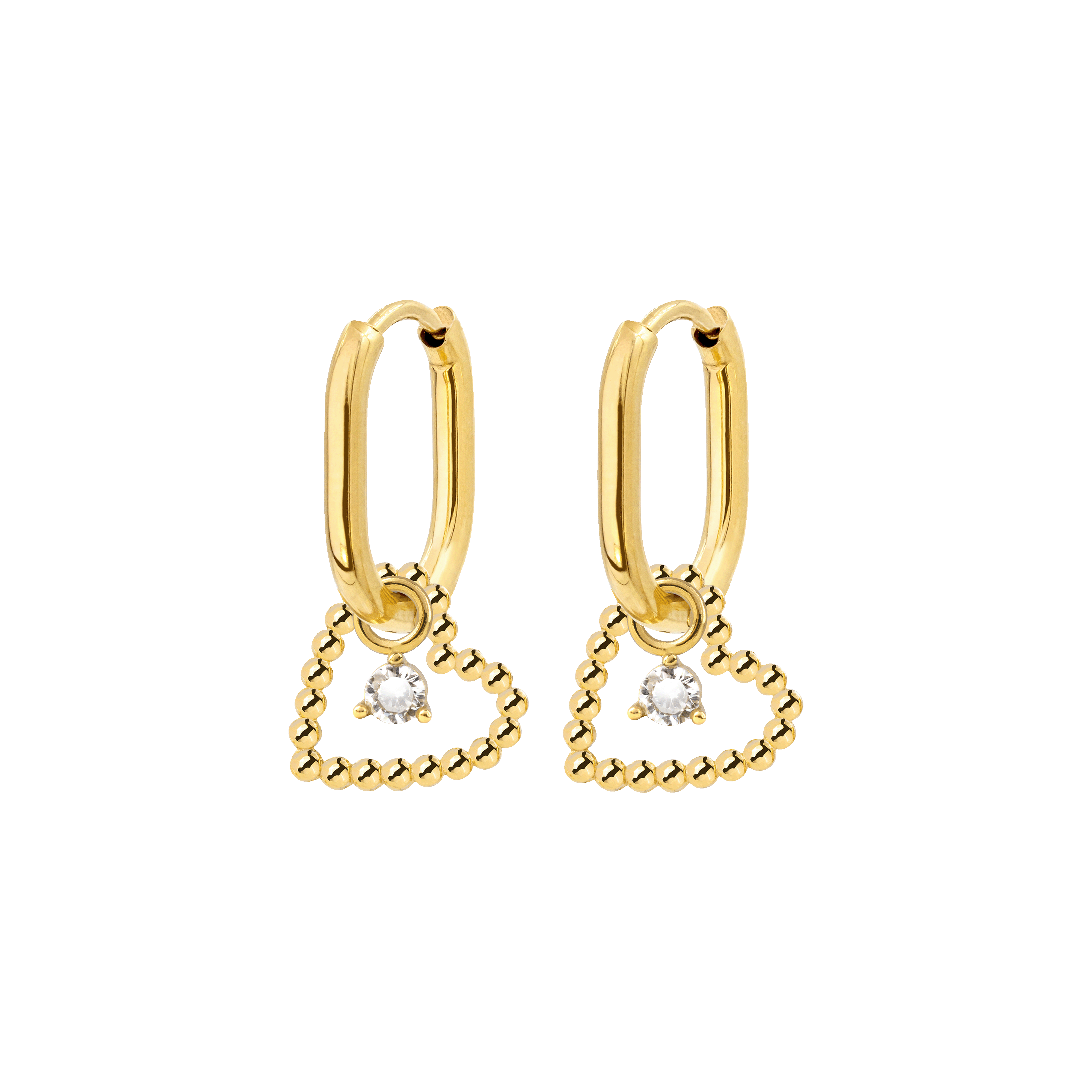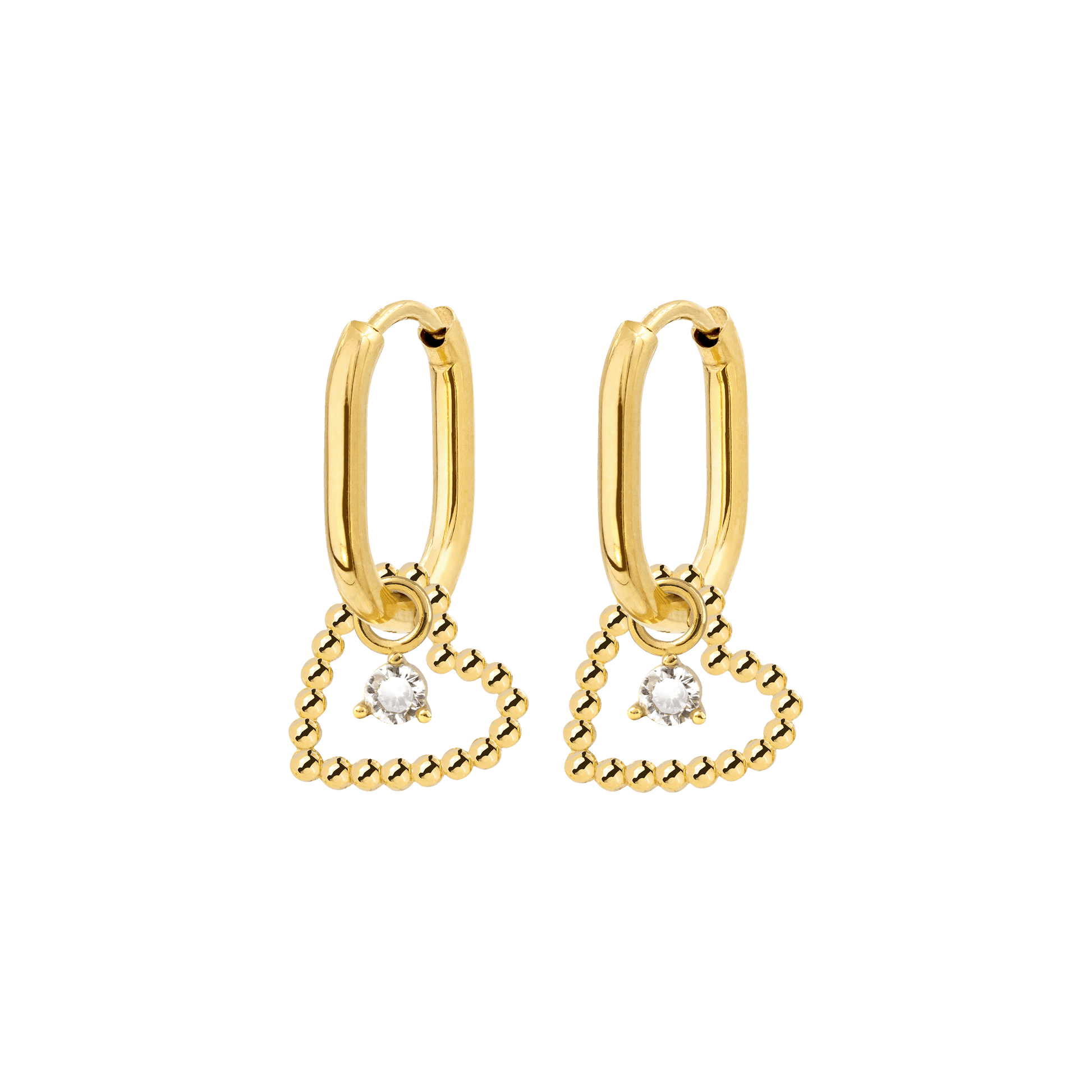 Perché scegliere un solo charm quando puoi averne due? Con il nostro set di orecchini 'Heart of Gold' Oval Hoop Set Baby hai proprio questo! La combinazione del cuore con design puntinato e la delicata pietra di zircone è un vero colpo d’occhio, che dona a ogni outfit un tocco dolce e scintillante – perfetto per te o come regalo per una persona speciale con un cuore d’oro puro!