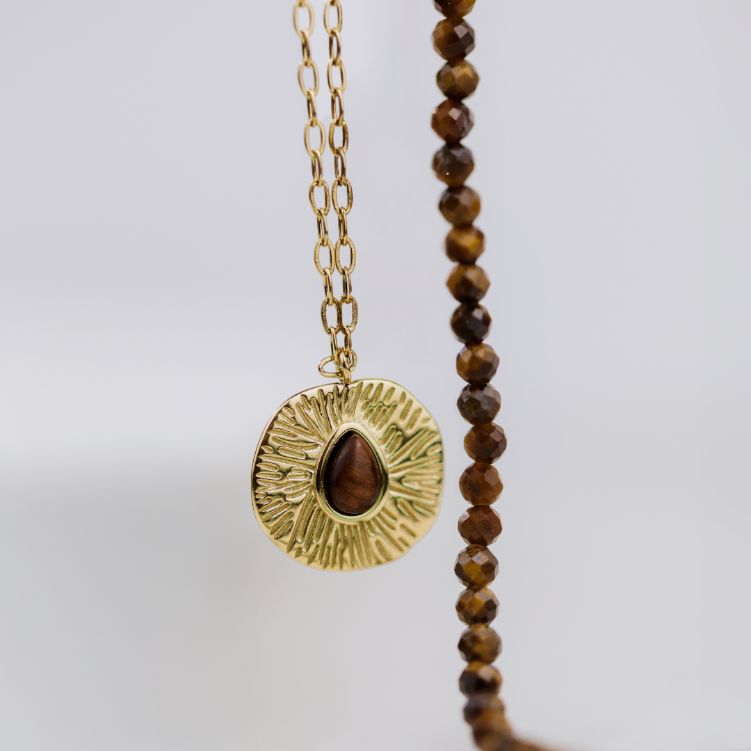 L’occhio di tigre è popolare nei gioielli non solo per il suo colore marrone caldo, ma anche per le proprietà attribuite a questa pietra. Da secoli, soprattutto in Asia orientale, l’occhio di tigre viene usato come talismano o amuleto e si dice rifletta le qualità della tigre: forza, coraggio e vitalità. Indossare questa pietra può aiutarti a mantenere la calma nelle situazioni stressanti e a lasciarti guidare dal tuo istinto e dalla tua intuizione. Il nostro bundle “Into the Wild” combina la collana “Tiger’s Eye Bead”, composta da piccole perle tonde di occhio di tigre, con la collana “Terra”, caratterizzata da un pendente a forma organica con occhio di tigre a goccia al centro. Le sue variazioni naturali di colore, dal marrone espresso scuro all’ocra caldo, creano profondità e un set unico che non solo completa il tuo outfit, ma supporta anche la tua sicurezza in te stessa. Non lasciartelo sfuggire!