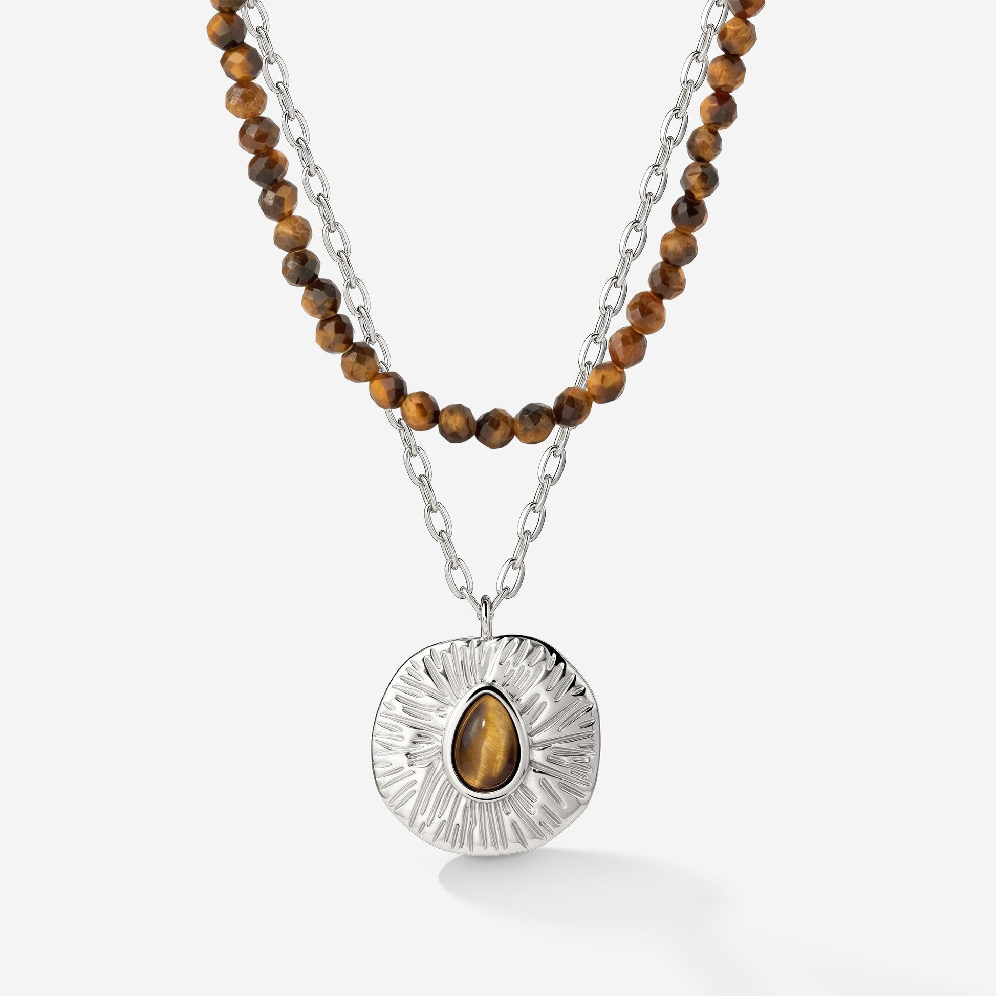 L’occhio di tigre è popolare nei gioielli non solo per il suo colore marrone caldo, ma anche per le proprietà attribuite a questa pietra. Da secoli, soprattutto in Asia orientale, l’occhio di tigre viene usato come talismano o amuleto e si dice rifletta le qualità della tigre: forza, coraggio e vitalità. Indossare questa pietra può aiutarti a mantenere la calma nelle situazioni stressanti e a lasciarti guidare dal tuo istinto e dalla tua intuizione. Il nostro bundle “Into the Wild” combina la collana “Tiger’s Eye Bead”, composta da piccole perle tonde di occhio di tigre, con la collana “Terra”, caratterizzata da un pendente a forma organica con occhio di tigre a goccia al centro. Le sue variazioni naturali di colore, dal marrone espresso scuro all’ocra caldo, creano profondità e un set unico che non solo completa il tuo outfit, ma supporta anche la tua sicurezza in te stessa. Non lasciartelo sfuggire!