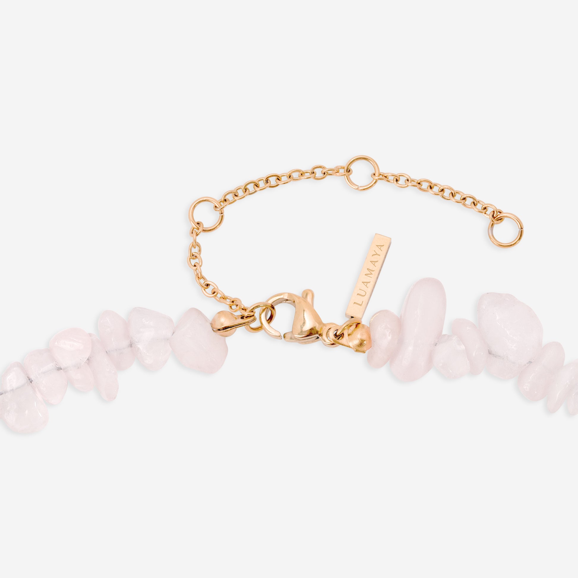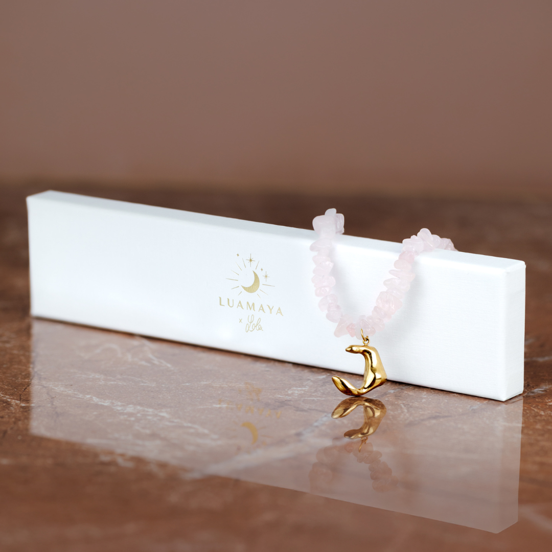Già nella mitologia greca e romana, il quarzo rosa era considerato la pietra dell’amore, della sensibilità e del romanticismo, ed è spesso chiamato anche la pietra curativa del cuore. Inoltre, questa gemma ha un effetto calmante e può favorire l’armonia dentro di te e nelle tue relazioni. Il nostro choker “Lovely Lotti” in quarzo rosa diventa qualcosa di davvero speciale grazie al ciondolo a forma di luna dal design organico. Può aiutarti a rafforzare la tua autostima e a ritrovare il contatto con te stessa e con il tuo cuore. Lasciati trasportare dall’energia femminile delle pietre preziose e della luna!