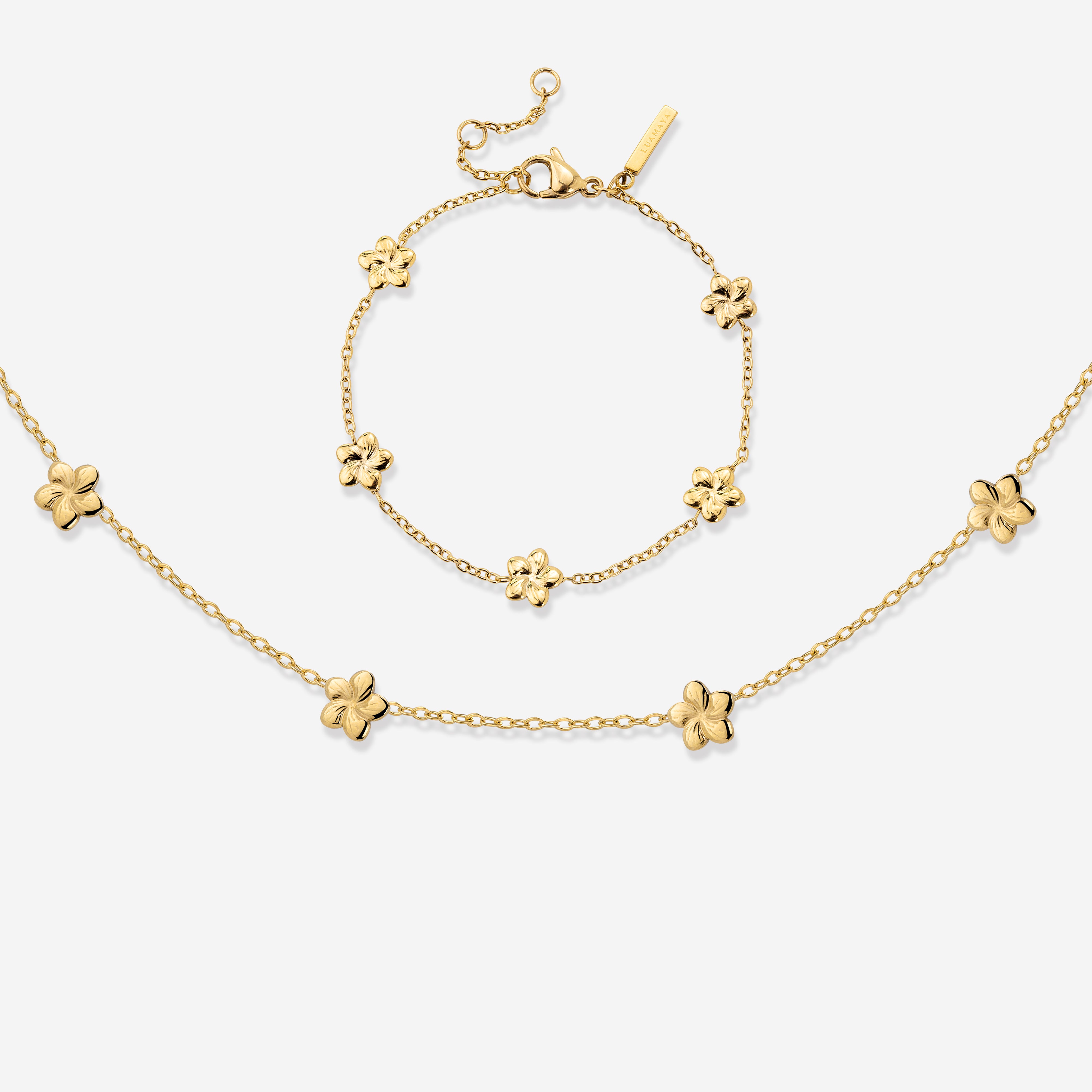 Quando pensi alla primavera, all’estate e al bel tempo, probabilmente ti viene in mente un prato con fiori sparsi tra l’erba verde, mentre gli uccellini cinguettano sullo sfondo. Guardando il nostro bundle “Meadow”, il choker e il bracciale omonimi ci ricordano esattamente questa scena! Cinque piccoli e adorabili ciondoli a forma di fiore decorano le delicate catene, portando vibrazioni positive garantite nella tua quotidianità.