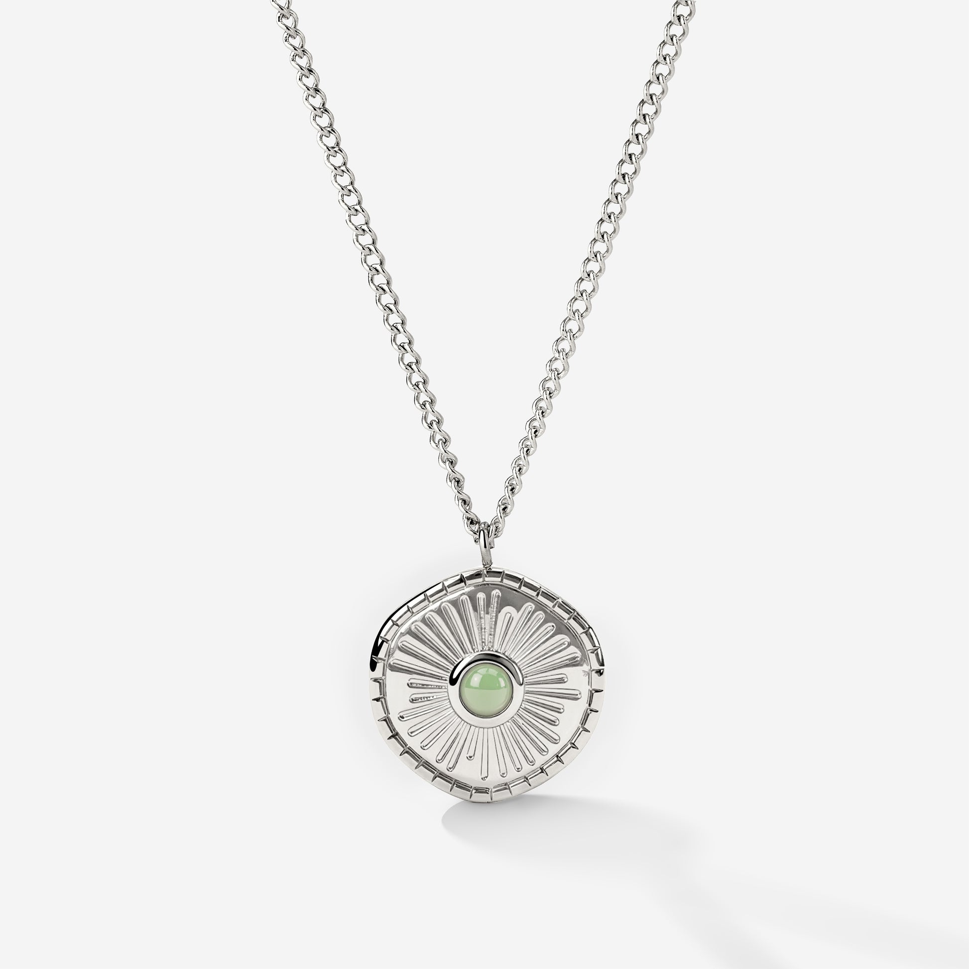 Il quarzo è spesso considerato una pietra di purezza e protezione e si presenta in natura in molte forme e colori diversi. Il quarzo verde è associato all’armonia e si dice aiuti a sciogliere i blocchi emotivi. Nella nostra collana “Moss”, il piccolo quarzo verde naturale è il punto focale del gioiello. Incorniciato da un ciondolo a moneta dalla forma organicamente arrotondata, risulta discreto ma presente, valorizzato da sottili incisioni che lo fanno risplendere. Lascia che questa collana diventi il tuo piccolo portafortuna e un promemoria quotidiano di equilibrio ed energie positive – non lasciartela sfuggire!