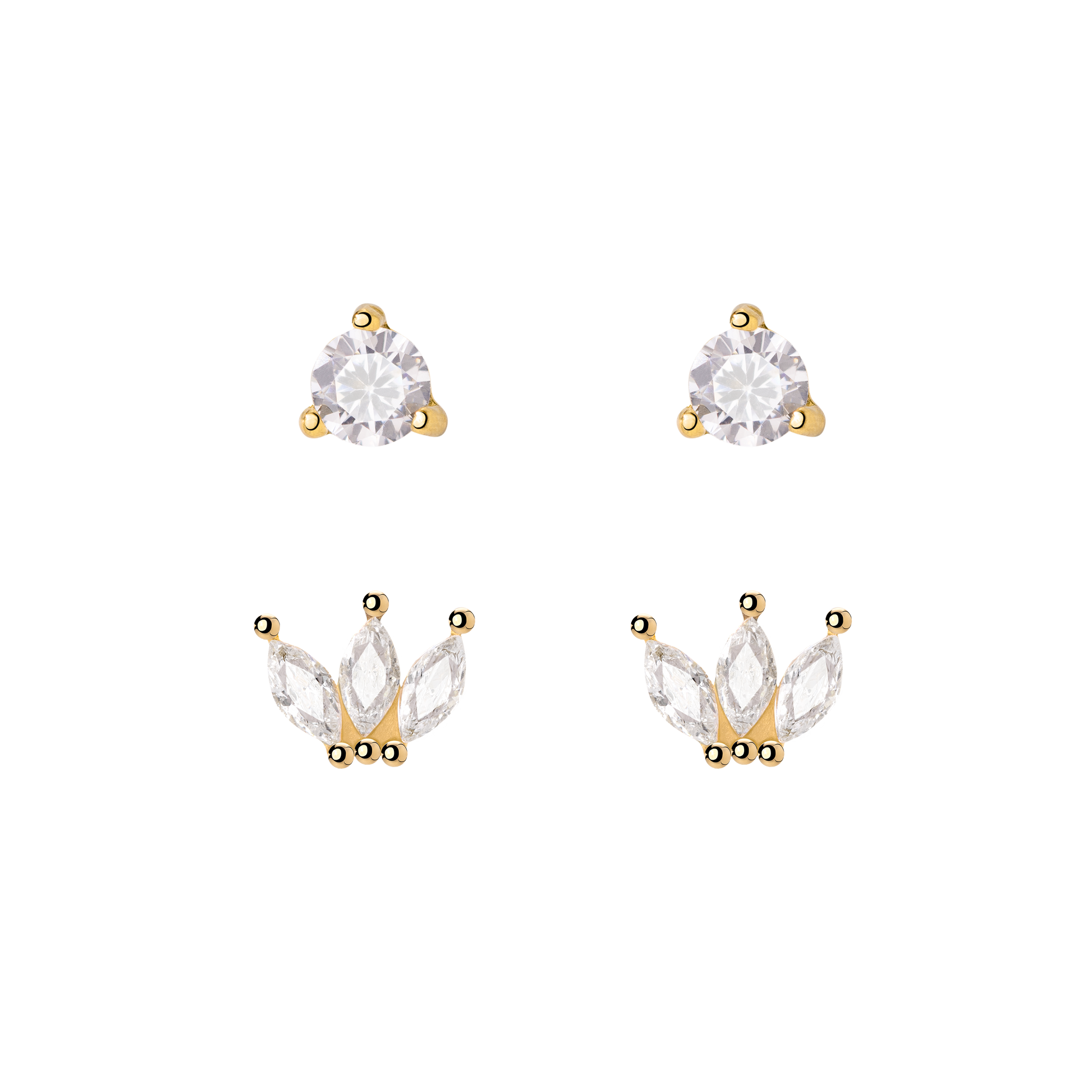 Con il nostro 'Royalty' Stud Bundle, ottieni sia i nostri 'Glimmer' Studs che i nostri 'Royalty' Studs in un unico set, così non dovrai preoccuparti del tuo outfit—ci pensiamo noi. Questa combinazione ti offre il perfetto allrounder scintillante che non può mancare nella tua scatola dei gioielli. Gli zirconi in entrambe le coppie di orecchini sono il vero punto forte!