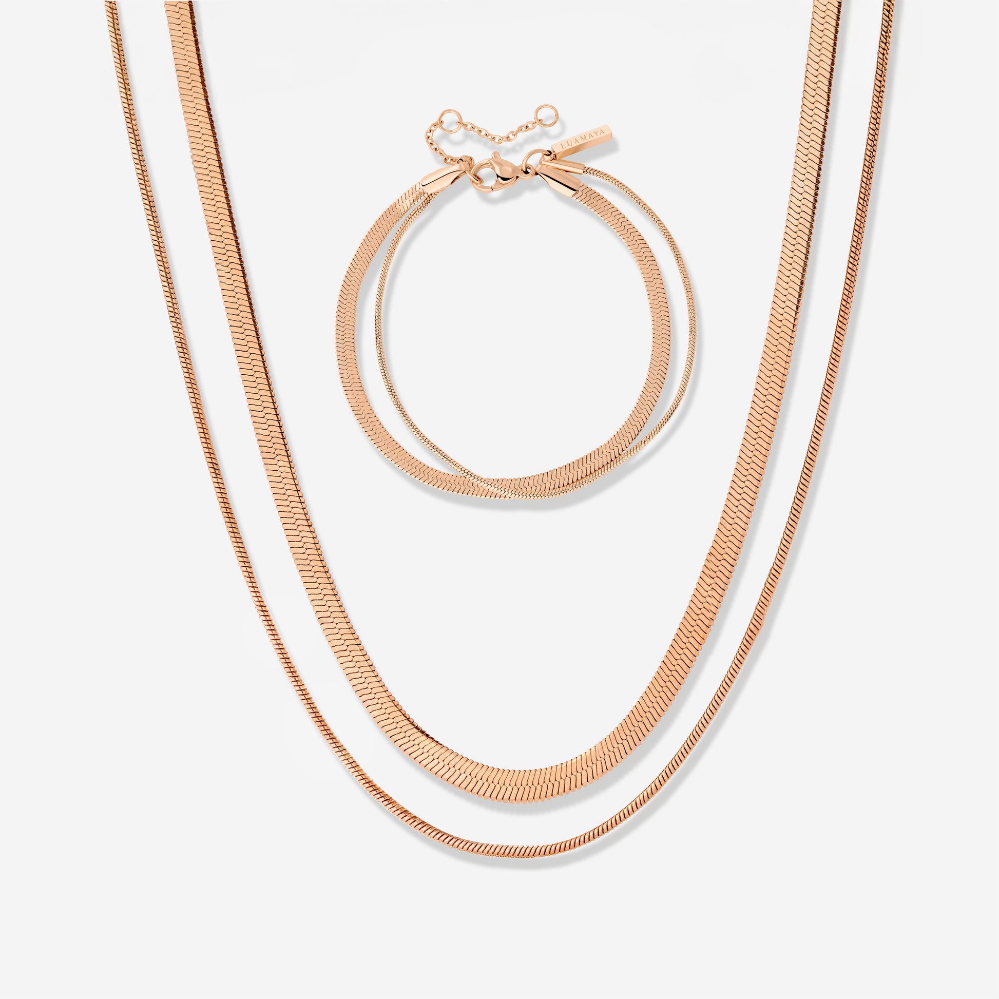 Le catene snake si caratterizzano per gli anelli strettamente uniti, creando una texture liscia e lucida che le rende gioielli moderni e popolari. Il nostro bundle “Snake Chain” combina la versione più larga e piatta con una snake chain più sottile e rotonda, creando un look pronto da indossare con collana e bracciale. Il suo design minimalista rende questo set perfetto non solo per tutti i giorni, ma aggiunge anche eleganza ai tuoi outfit più curati. Indossali da soli o insieme e lasciati conquistare dalla versatilità delle catene snake!
