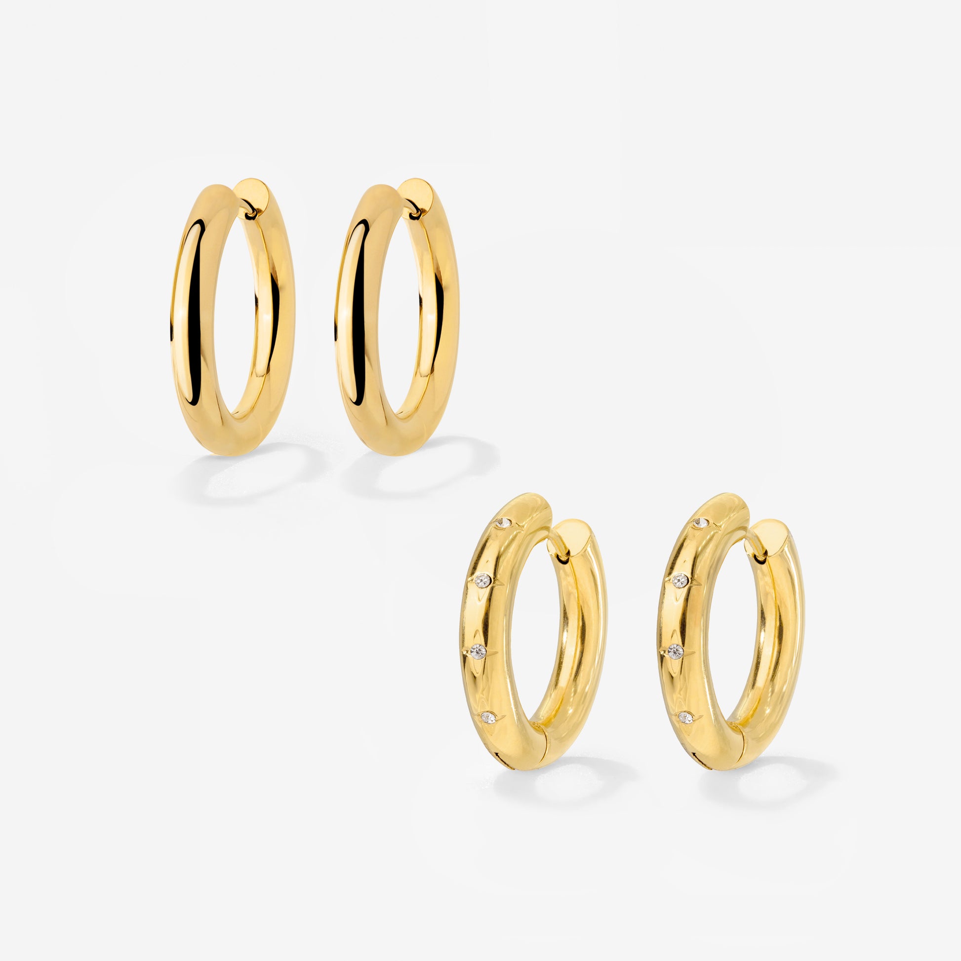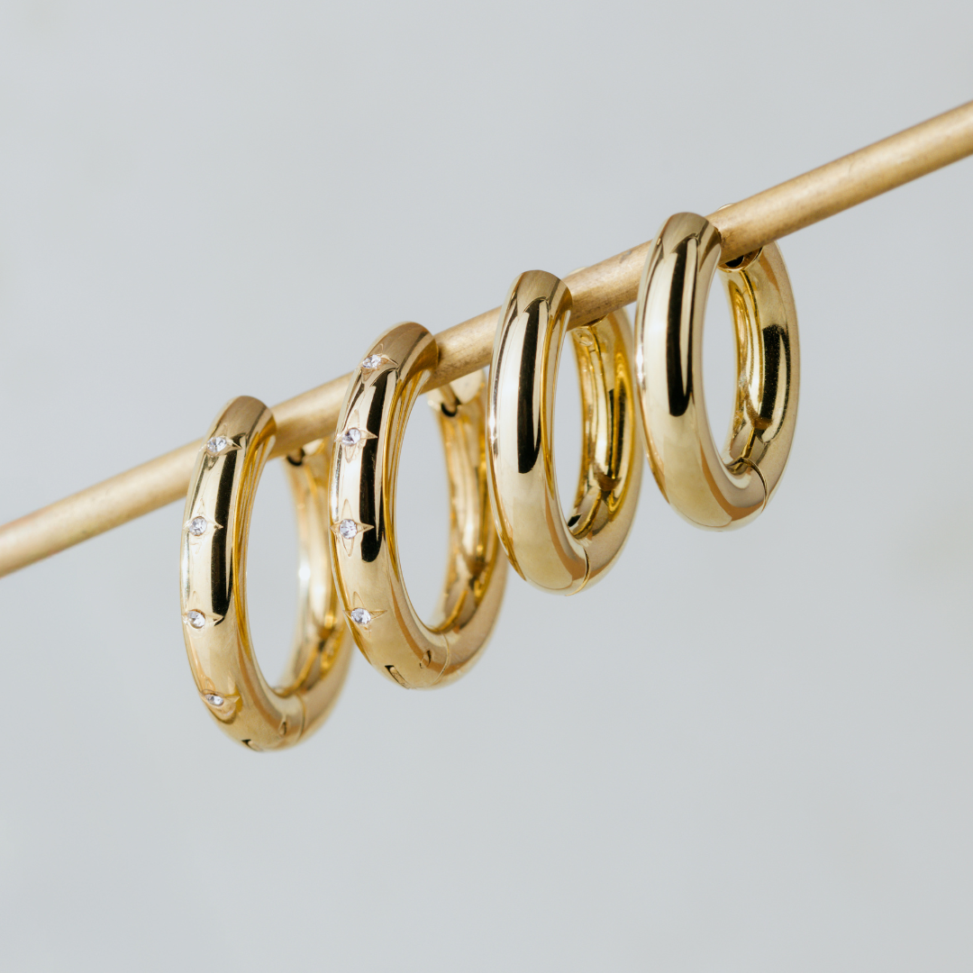 Chunky plus chunky makes bold and classy! Grab our basic “Chunky Hoopies” and our “Cute Stargaze Hoops” in size Medium and wear them together for the perfect match. While one pair is clean and simple, the other shines with sparkling cubic zirconia stones, adding glamour and sparkle to your look. Just like the stars in the sky, you can make yourself and your outfit shine!