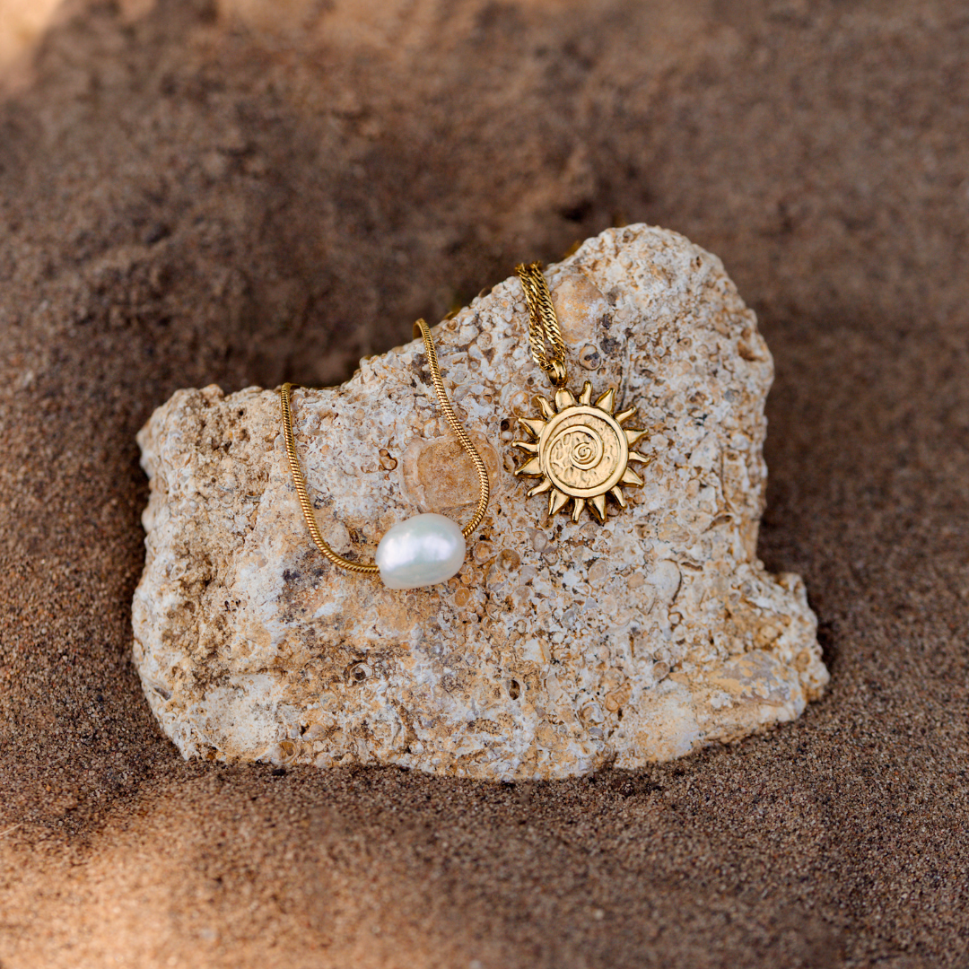 Cosa si abbina meglio a un pendente a sole luminoso se non le classiche perle d’acqua dolce? Con il nostro bundle “Sunny Pearls” ottieni entrambi in un’unica soluzione e non dovrai più preoccuparti di come creare il tuo look a strati. La nostra collana “Sunny Swirl”, con la sua delicata catena Singapore intrecciata e il pendente a sole ricco di dettagli, si abbina perfettamente alla “Minimalist Pearl” Necklace, caratterizzata da una catena snake rotonda e raffinata con una splendida perla d’acqua dolce lucente. Provala subito!