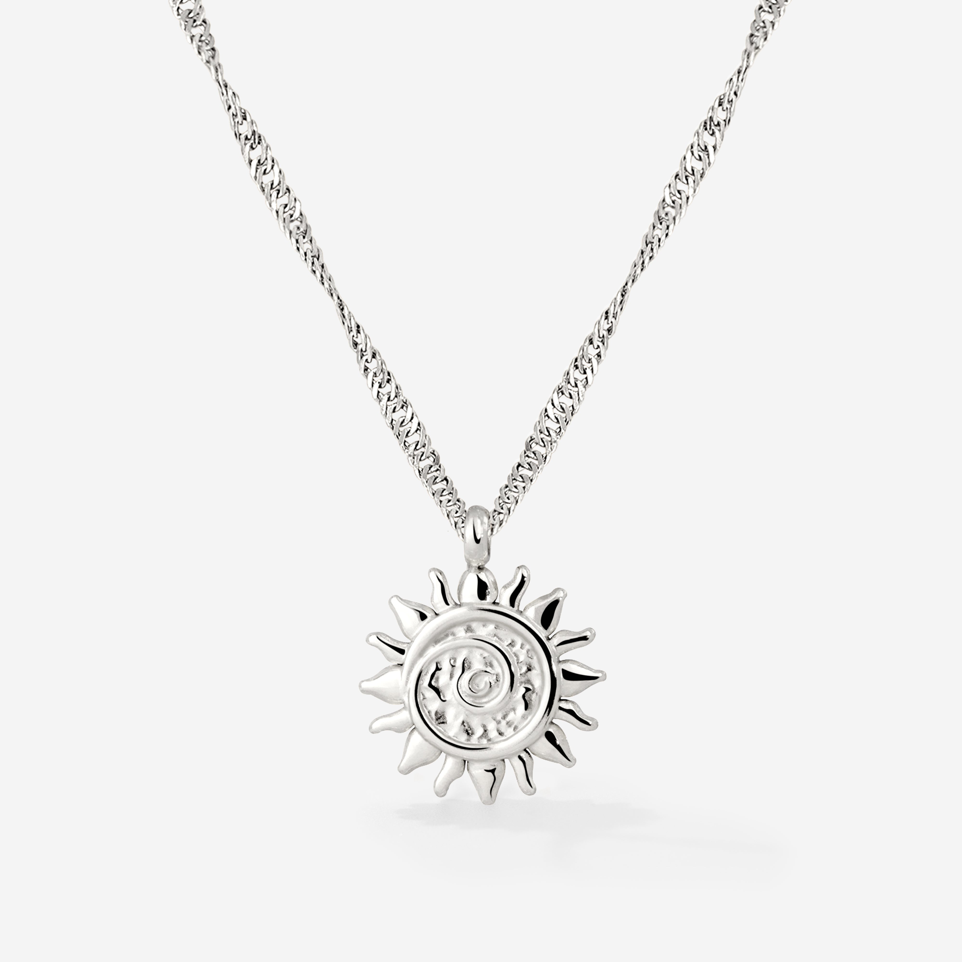 La nostra collana 'Sunny Swirl' combina l'intramontabile motivo del sole con il design moderno a vortice ed è uno dei pezzi forti della nostra collezione. Il ciondolo dettagliato appare particolarmente elegante sulla delicata catena Singapore, arricchendo qualsiasi tuo look, sia indossato da solo che a strati. Prendi ora il tuo pezzo preferito per gli amanti del sole!