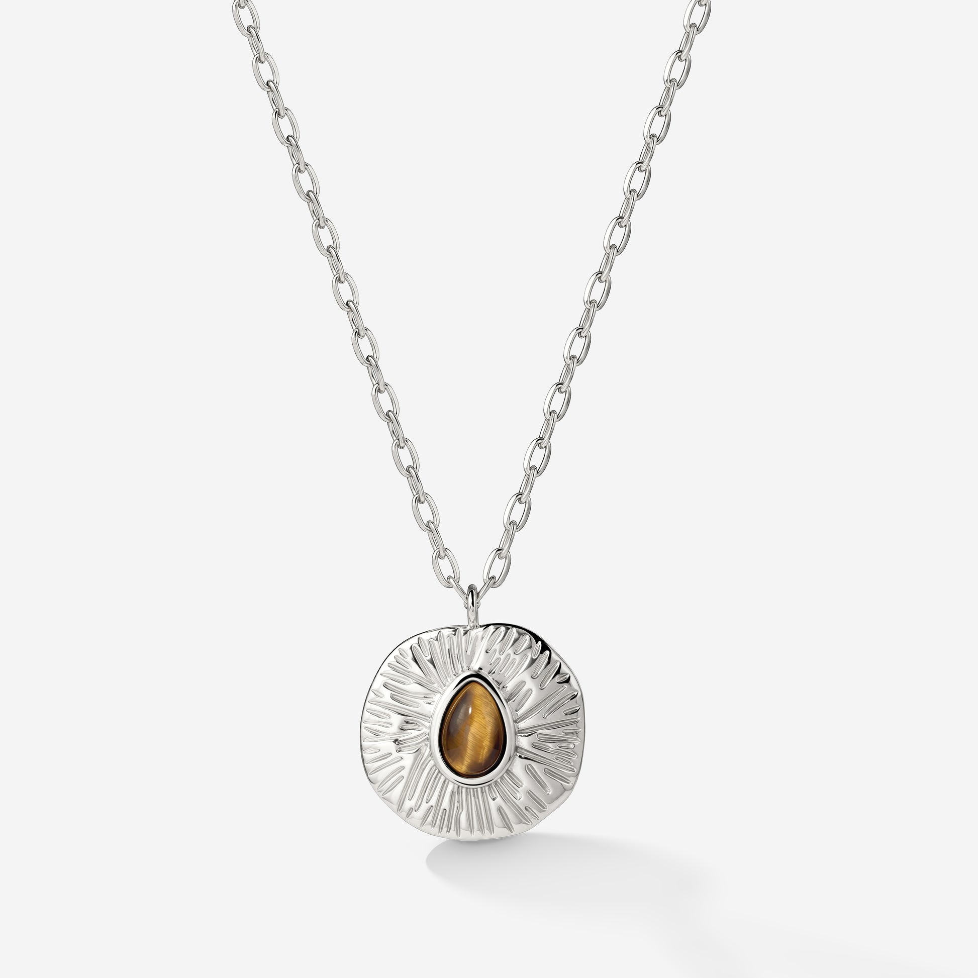 L’occhio di tigre è popolare nel design dei gioielli non solo per il suo colore marrone caldo, ma anche per le proprietà attribuite a questa pietra. Da secoli, soprattutto in Asia orientale, l’occhio di tigre viene usato come talismano o amuleto e si dice che rifletta le qualità della tigre: forza, coraggio e vitalità. Indossare questa pietra può aiutarti a mantenere la calma nelle situazioni stressanti e a lasciarti guidare dal tuo istinto e dalla tua intuizione. Nella nostra collana “Terra”, l’occhio di tigre è inserito a forma di goccia in un pendente rotondo e organico, trasmettendo un vibe naturale sulla delicata O-chain. Sottili linee incise rendono il pendente a moneta ancora più interessante, dando l’impressione che crescano direttamente dalla pietra. Non lasciarti sfuggire questa collana unica!