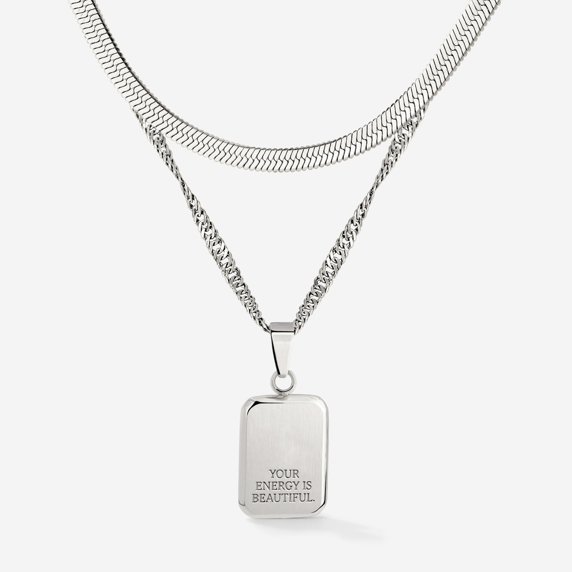 Il nostro bundle “Your energy is beautiful” è il tuo promemoria quotidiano che la tua aura è la cosa più bella che possiedi. La delicata Singapore chain leggermente intrecciata si abbina perfettamente al ciondolo rettangolare inciso e valorizza ogni outfit. Insieme alla nostra semplice collana “Slim Herringbone”, questo set è ideale per tutti i giorni e ogni occasione. Il messaggio inciso è il tocco finale di un gioiello che ti accompagnerà ogni giorno. Regalati questo set o dimostra ai tuoi cari quanto apprezzi la loro presenza e energia. Ricorda sempre: ciò che emani ti circonda come un’aura.