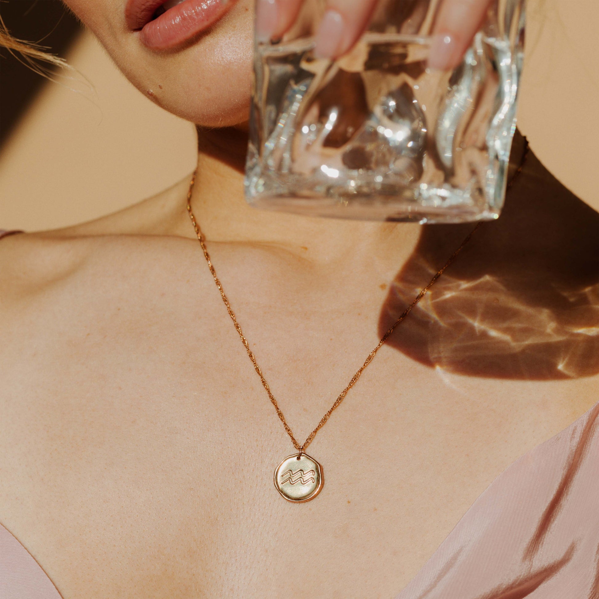 Il ciondolo a doppia faccia del nostro collare 'Aquarius / Wassermann' si abbina perfettamente alla catenina di Singapore elegante e delicata e può essere indossato da solo o come parte di un insieme con molti altri gioielli. Ideale per te stesso o come regalo magico e personale per i tuoi cari.