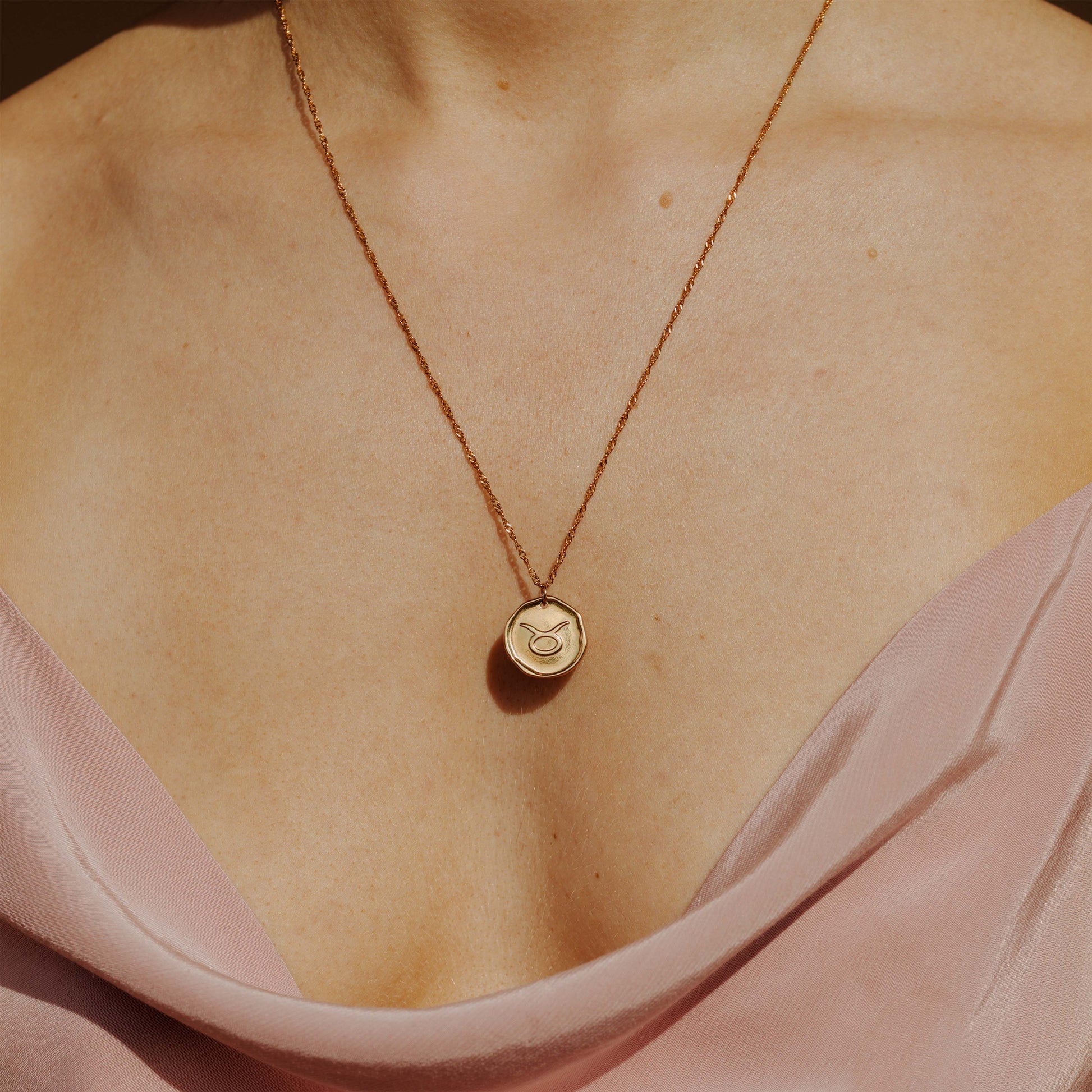 Il ciondolo a doppia faccia del nostro collare 'Taurus / Stier' si abbina perfettamente alla catenina di Singapore elegante e delicata e può essere indossato da solo o come parte di un insieme con molti altri gioielli. Ideale per te stesso o come regalo magico e personale per i tuoi cari.